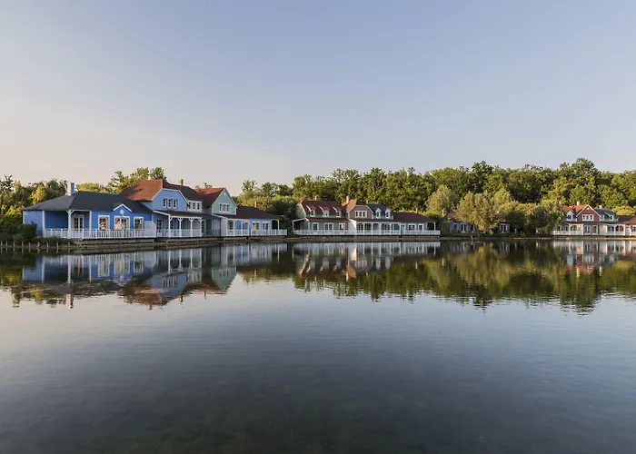 Center Parcs Le Lac D'Ailette, a 5-star Chamouille hotel with a rating of 7.3/10 on Booking.com, features a water park, 13 water slides, and various outdoor activities on a picturesque lake. The property includes multiple dining options, shops, and recreational facilities.
