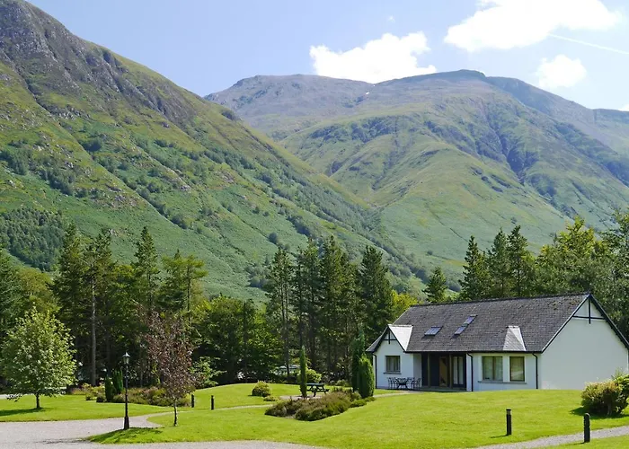 Glen Nevis Holidays, a 4-star Fort William hotel with a 9.3/10 rating on Booking.com, offers a range of highland lodges and holiday homes surrounded by scenic landscapes. Guests can enjoy amenities including free Wi-Fi, a restaurant, and outdoor seating areas with mountain views.