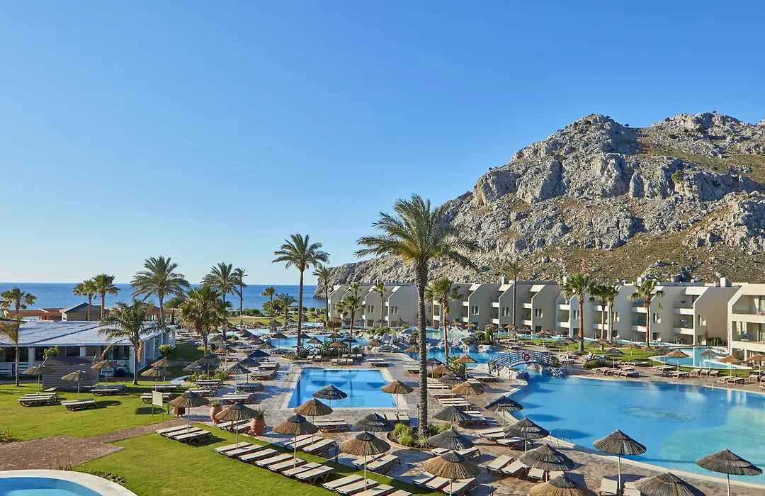 Atlantica Aegean Blue offers a beachfront location with direct access to the crystal-clear Aegean Sea in Kolymbia. This 5-star property features a water park, a range of dining options, and family-friendly accommodations, providing a comprehensive holiday experience.