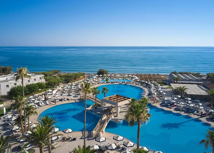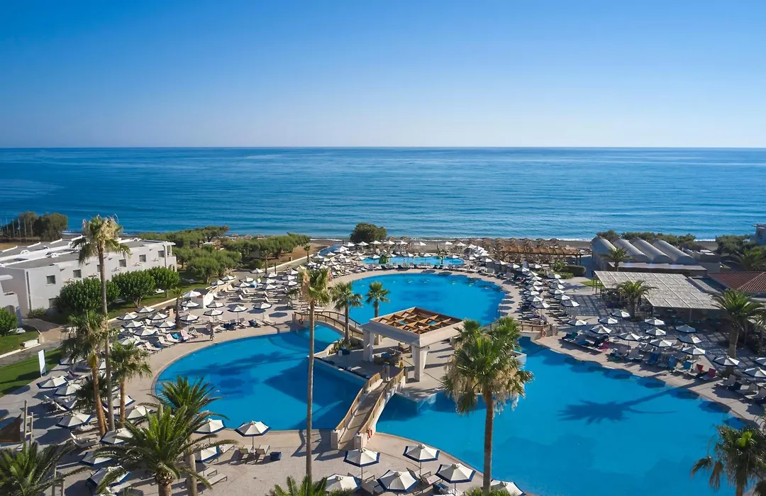 Atlantica Ocean Beach Resort offers a 5-star experience featuring direct access to Maleme Beach, upscale accommodations, and a variety of family-friendly amenities. The resort includes a large pool complex and on-site dining options.