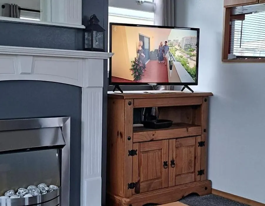 Rooms at Seaview Caravan Park Plot 117 feature two bedrooms, a private bathroom with a shower, and a seating area. The kitchen includes a stovetop, oven, refrigerator, and dining table. Relax on the terrace with garden views or enjoy the flat-screen TV in the living area.