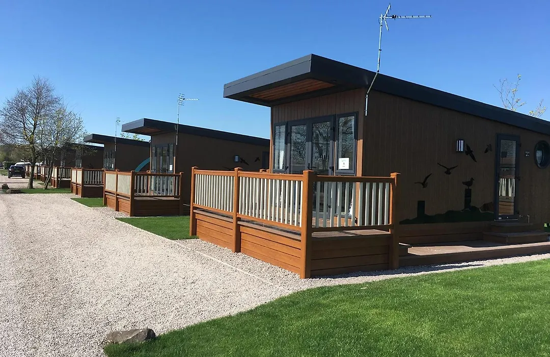 The accommodations at Wild Rose Holiday Park feature modern amenities, including a fully equipped kitchen with stovetop, refrigerator, and kitchenware. Guests can enjoy relaxing on the full wrap-around UPVC decking, accessible through double doors that bring natural light indoors. Free-standing sofas provide a comfortable lounging space in the living area.